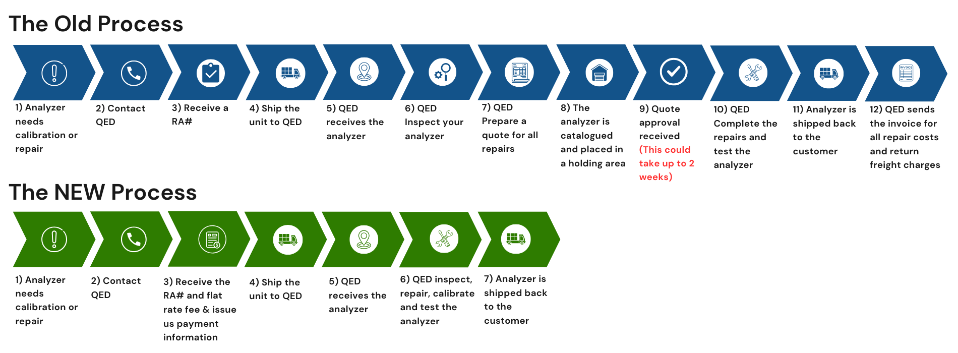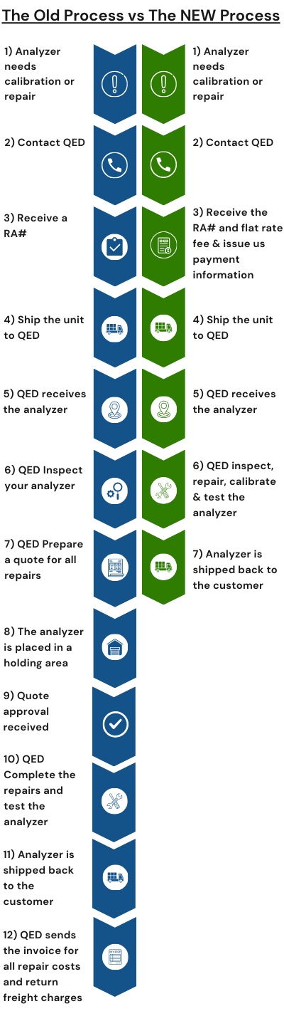 Under our previous service process, if your analyzer needed repair or calibration, you would contact QED, and we would issue a Return Authorization number. You would then ship the unit to us. We would receive the analyzer, inspect it and send you a quote for all necessary repairs, (this would include an inspection fee and calibration fee). Your analyzer would then be placed in our holding area while we waited for approval of the quote. Those approvals were often delayed as long as two weeks, adding a lot of time to the process. Once quote approval was received, we would complete all repairs, test the unit and ship back to you. We would then invoice you for all repair costs and return freight charges.