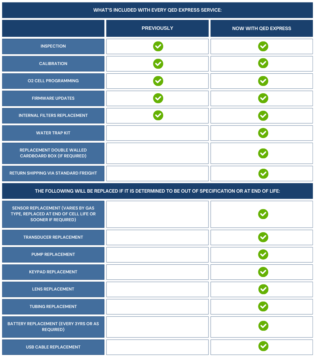 Using QED Express is easy – we do all the work on our end. Just enter a service request on our website and we handle the rest. This includes any instruments that are currently covered under bi-annual service as we are extending the service and calibration interval for instruments to one annual service. The process for you stays the same, all you need to do is fill in your relevant form to arrange a service.