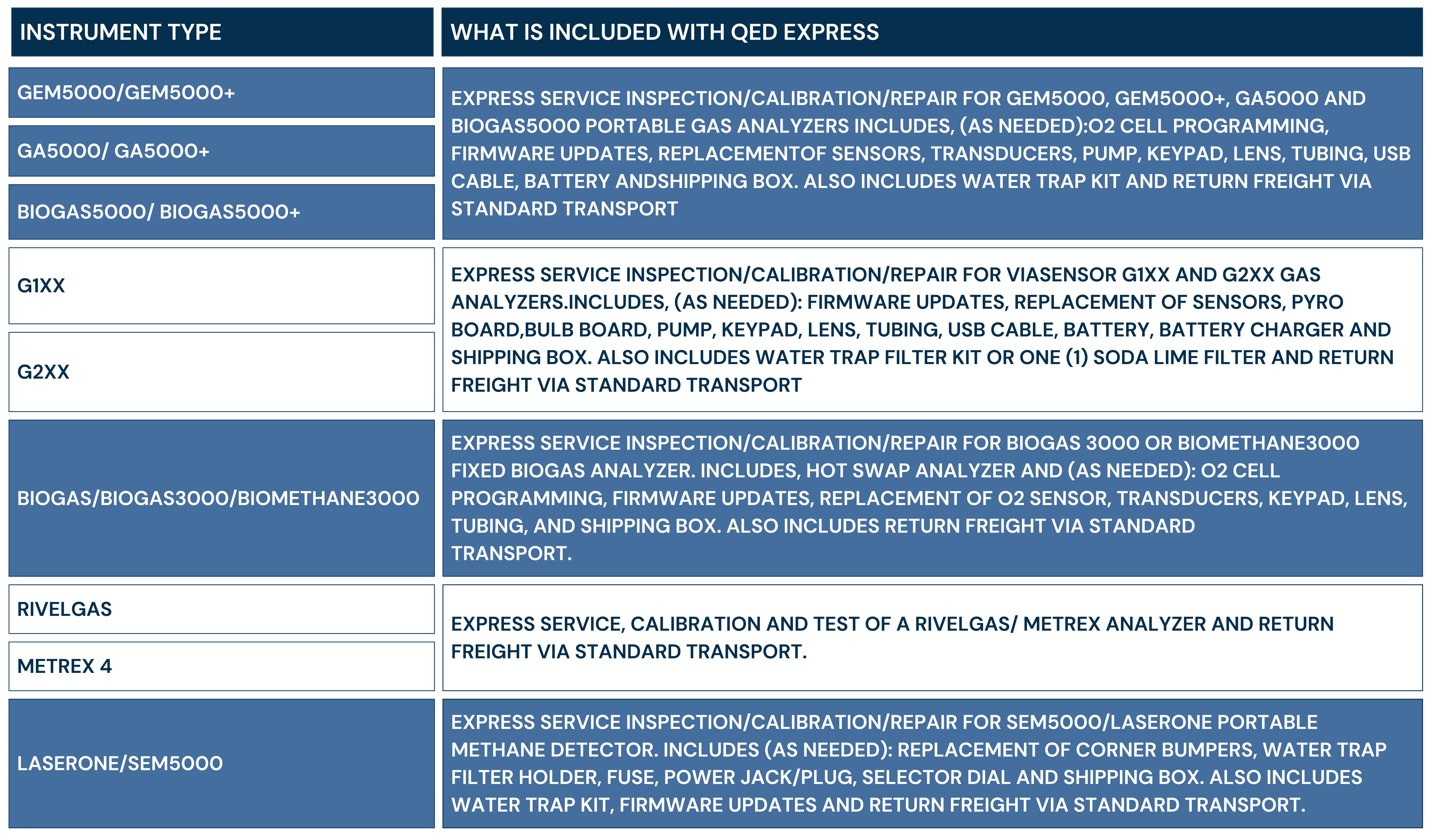 The chart below provides a quick overview of what is included, or click here to see the details of the service performed for each instrument model.